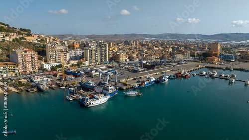 Aerial view of the port and city of Licata, a small town in the province of Agrigento, Sicily, Italy. The city seafront overlooks the Mediterranean Sea.