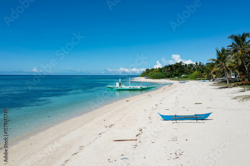 Aerial view of the pristine white beach meeting the turquoise sea, with fishing boats resting near lush palm trees, Carles, Western Visayas, Philippines.