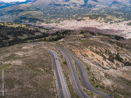 Aerial view of the roadway to Huaraz city with green mountains in the background in the Peruvian Andes