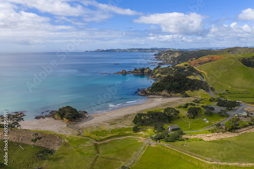 Aerial view of the turquoise waters meeting the sandy beach, contrasting with the lush green hills and rugged coastline, Elliots Bay, Northland Region, New Zealand.