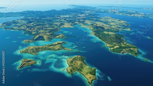 Aerial view of tropical archipelago islands, turquoise waters, lush green landscapes