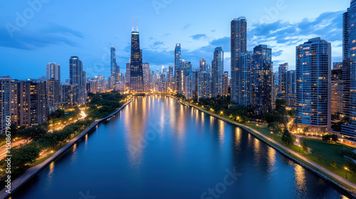 Aerial view of urban skyline with riverside reflection, showcasing vibrant city lights at dusk