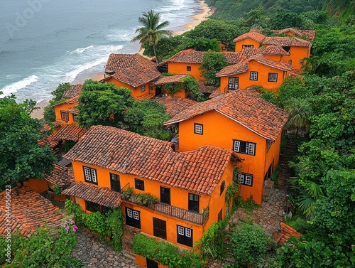 Aerial view of vibrant orange houses nestled on a hillside overlooking a tranquil beach and ocean