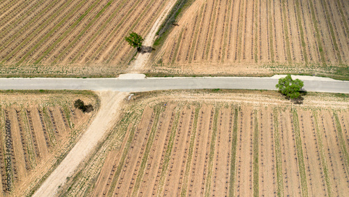 Aerial view of vineyards in early spring in the province of Valladolid in the Ribera del Duero appellation of origin area in Spain