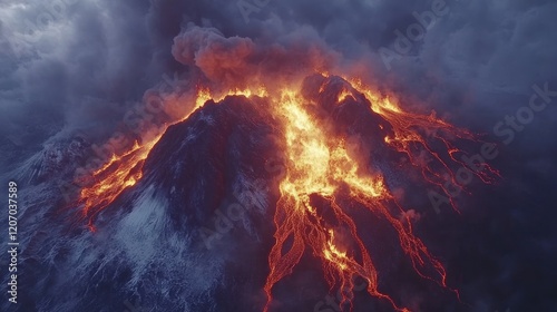 Aerial view of volcanic eruption, fiery lava flows, stormy sky, disaster film