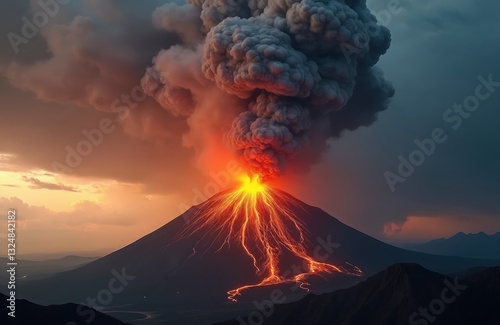 Aerial view of volcano eruption with smoke and lava flowing down mountain. Natural disaster on island. Orange flames sunset landscape background. Tour destination or inferno hell concept.