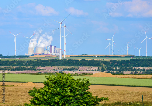 Aerial view of wind turbines standing tall against the skyline, contrasting with the industrial complex in the distance, Lutzerath, Rhineland-Palatinate, Germany.