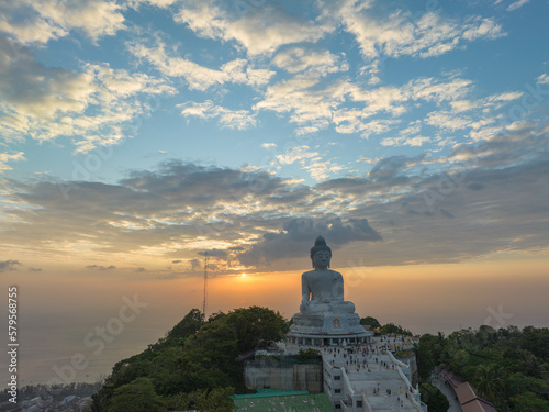 aerial view Phuket big Buddha in beautiful sunset..the sun shines through the clouds impact on ocean surface.The beauty of the statue fits perfectly with the charming nature..cloud scape background..