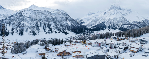 Aerial view shows Lech and Oberlech in the Austrian Alps, snow on chalets and hotels, pine forests, wide ski slopes, chairlifts, and roads under soft overcast midday light.