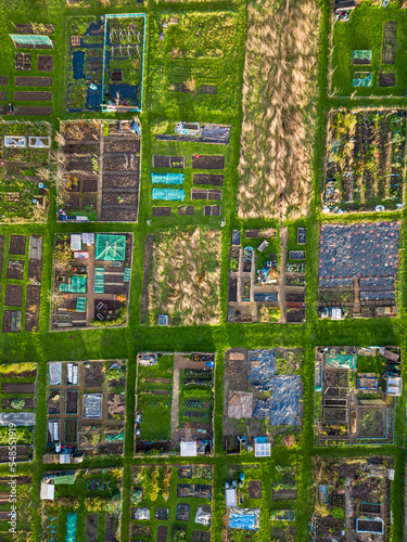 Aerial view, vertical shot, of pattern of allotments and vegetable raised beds