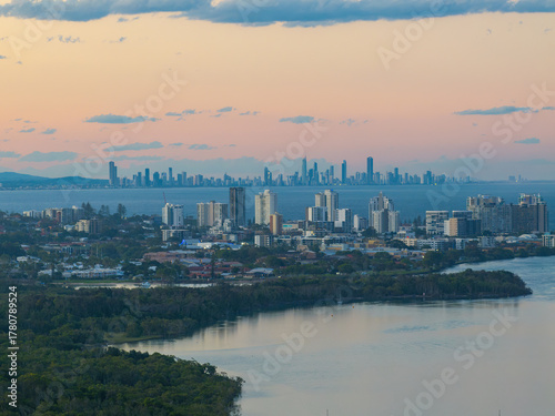Aerial views of the Tweed Heads and Coolangatta coastline from Fingal Head and Gold Coast skyline in the background