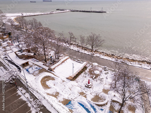 winter, beach, snow, sea, ocean, coastline, aerial, drone, landscape, nature, road, house, tree, sunlight, shore, scenic, tranquil, peaceful, contrast, cold, season, environment, calm, wave, white, blue, seasonal, coastal, village, weather, travel, tour tourism, glacé, sky, urban, harbor, photo, serenity, minimalism, perspective, beauty, scenic view, topview