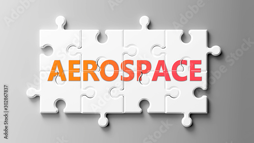 Aerospace complex like a puzzle - pictured as word Aerospace on a puzzle pieces to show that Aerospace can be difficult and needs cooperating pieces that fit together, 3d illustration