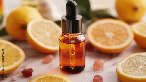 Aesthetic bottle of essential oil surrounded by fresh lemon slices and crystals, perfect for wellness and beauty themes.