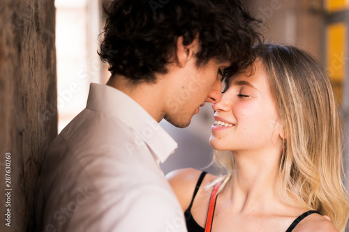 affectionate, young, couple, love, city, caucasian, 2, pair, people, man, close, together, enjoying, romantic, happiness, affection, leisure, romance, urban, bonding, togetherness, italy, casual attire, human relationships, heterosexual, outdoors, urban scene, verona, attractive, positive, smiling, tenderness, passion, shirt, touching, alley, profile, eyes closed, half face, closeup, adult, woman