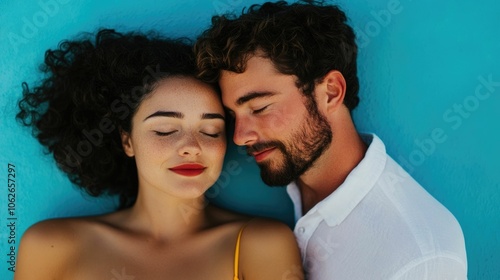 couple, love, intimacy, moment, romance, passion, affection, tenderness, hugs, togetherness, human relationships, bonding, connection, calmness, serene, peaceful, relaxation, rest, portrait, closeup, head shot, eyes closed, smiling, happiness, emotion, feeling, lifestyle, human, adult, young, attractive, skin, hair, fashion, style, apparel, blue, background, studio, depth of field, blur, sharpened, contrast, affinity, amity, ardour, attachment, bliss, camaraderie