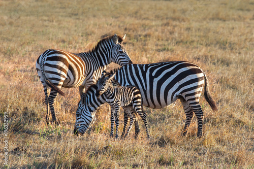 Africa. Zebras with the cub. Safari in Africa. Three zebras with a baby. Kenya. Travel to Kenya.
