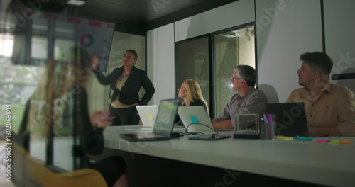 businesswoman, african american, presentation, team, meeting, office, corporate, modern, leadership, communication, strategy, screen, datum, chart, professional, workspace, diversity, group, female, speaker, standing, colleague, planning, technology, discussion, business, indoor, laptop, attention, explaining