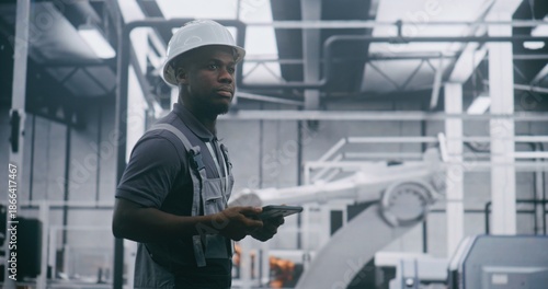 African American Factory Worker in Hard Hat Uses Handheld Device While Monitoring Robotic Equipment Inside Modern Automated Manufacturing Facility. Industrial Automation, Smart Factory Workflow.