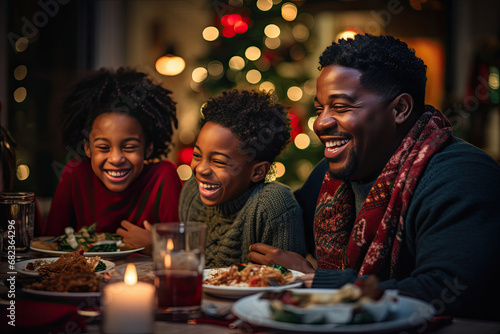 family, laughter, bonding, dinner, african american, holiday, joy, celebration, candle, home, children, happiness, meal, festive, warm, decoration, light, togetherness, smile, winter, cosy, cheerful, father, daughter, son, tradition, evening, indoor, christmas, seasonal, sharing, love, together, night, fun, dining, table, life events, content, joyous, community, culture, connection, affection, sibling, human relationships, gathering