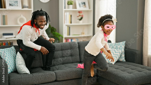 African american father and daughter smiling confident wearing superhero costume playing on sofa at home