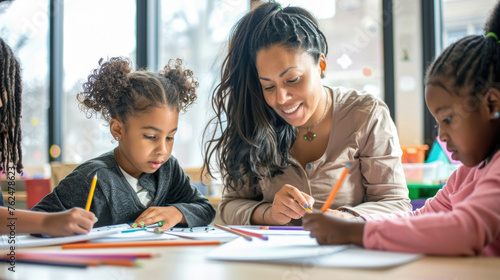 African American female teacher and little children in classroom writing or drawing on paper