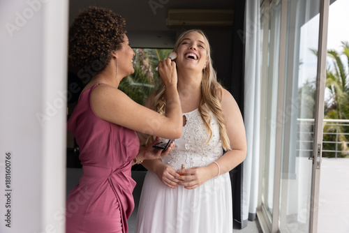 bride, wedding, brush, african american, celebration, elegance, luxury, glamour, beauty, fashion, portrait, powder, laughing, smile, adult, female, compact, accessory, balcony, palm tree, bright, daylight, sunny, modern, interior, air conditioning, railing, tiled floor, closeup, relaxed, happiness, preparation, event, ceremony, standing, stylish, joyful, cheerful, natural light, cosmetic