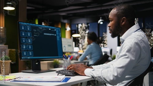african american, male, web, ai, task, business, objective, problem solving, futuristic, tech, black, employee, usage, monitor, communication, information technology, support, men at work, system, desktop, technology, smart, assistant, virtual, automation, dialogue, bot, speech, text, query, response, prompt, artificial intelligence, service, digital, interface, software, application, online, tool, office, staff, laptop, screen