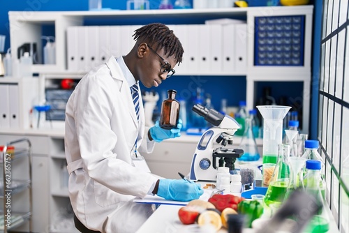 African american man scientist writing report holding bottle at laboratory