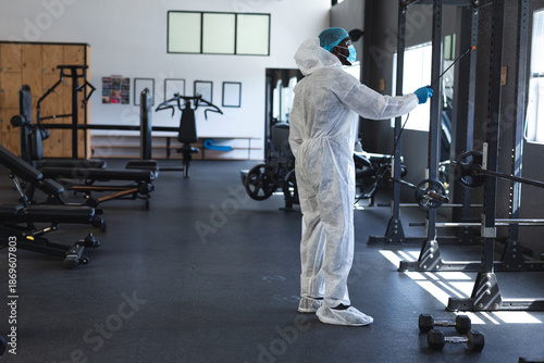 African American man spraying squat rack with sprayer wand in gym wearing coverall suit, copy space