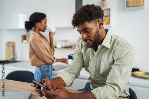 kitchen, home, technology, morning, communication, couple, black people, online, cyberspace, mobile phone, domestic life, casual attire, wireless technology, connectivity, browsing, scrolling, relaxing, breakfast, young adult, home, house, interior, lifestyle, togetherness, human relationships, woman, hot drink, drinking, routine, interaction, african american