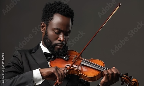 african american violinist in a black suit plays with deep concentration and artistry, highlighting the passion and elegance of classical music and live performance, studio shot portrait