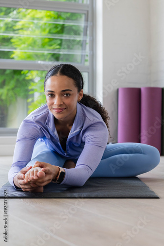 people, african american, woman, yoga, stretching, mat, window, lavandula, purple, sunlit, minimal, home, lifestyle, wellness, calm, adult, seated, butterfly, forward, foot, hand, sole, ponytail, curly, hoop, athletic, leggings, top, blue, dark, textured, rolled, foam, brick, wall, white, hardwood, natural, greenery, plant, exercise, mindfulness, relaxed, focused, studio