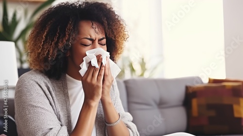 flu, sneeze, napkin, american, african, woman, cold, suffer, nose, runny, apartment, modern, cosy, disease, allergy, virus, adult, blow, fever, sick, symptom, disease, sofa, tissue, person, lifestyle, ethnicity, young, only, home, season, unhealthy, temperature, care, couch, condition, domestic, life, hair, ill, discomfort, female, to sit, kinky, human, house