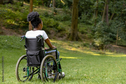 outdoors, outside, summer, harmony, peaceful, lifestyle, calmness, nature, park, greenery, sunlight, daylight, woman, well-being, african american, young, adult, rehabilitation, wheelchair, disability, recovery, one person, sitting