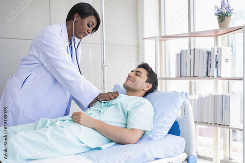 African doctor morning visit patient using stethoscope checking lung breath and heart pulse male in hospital