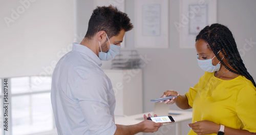 african, female, manager, smartphone, scan, vaccine, employee, male, office, men at work, safety, mask, showing, electronic, vaccination, certificate, employer, code, corona, virus, scanning, check, verify, validate, verification, checking, control, validation, pandemic, immunisation, vaccinate, man, show, immunity, immune, smart, phone, mobile, business, corporate, company