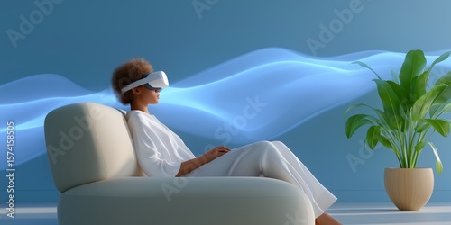 african, female, relaxing, virtual, reality, headset, modern, living, room, technology, interactive, innovation, digital, life events, entertainment, lounging, futuristic, stylish, creativity, comfort, solitude, leisure, serene, calming, plant, decor, furniture, interior, design, seated, cushion, sofa, afro, casual attire, minimalist, contemporary, light, ambience, calmness, blue, wave, peaceful, relaxation, sharpened, escape, visionary