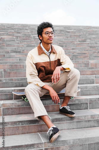 african, american, guy, black, leisure, lifestyle, sitting, skateboard, skater, skate, board, street, sport, style, urban, skateboarder, fun, relax, resting, bold, man, composition, afro, male, outside, portrait, rest, stair, up, chilling, fashion, casual attire, dude, peace, sneaker, african american, background, day, goggles, smiling, skateboarding, sky, square, sleepy, cool, photogenic, young, summer