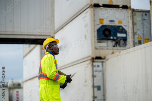 African technician dock worker in protective safety jumpsuit uniform and with hardhat and use digital tablet at cargo container shipping warehouse. transportation import,export logistic industrial