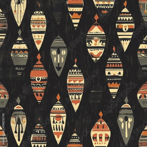 pattern, seamless pattern, tribal, african, mask, geometric, design, teardrop, dark background, texture, ethnic, culture, art, textile, fabric, wallpaper, background, illustration, ornate, decorative, vintage, retro, traditional, abstract, shape, style, motif, repeat, design element, print, bohemian, folk art, handcraft, tribal art