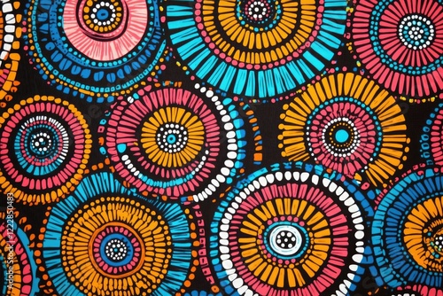 African wax print-style pattern with circular shapes and colorful lines, vibrant colors including a dark brown background