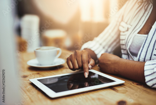 African woman working on a tablet, sitting in a cafe with coffee alone. Businesswoman using technology to do her job at her desk in the office. Lady casually scrolling the internet in a restaurant.