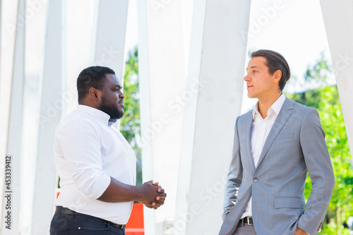 African-American businessman and his colleague in front of modern office building. Financial investors are talking outdoor. Banking and business concept.