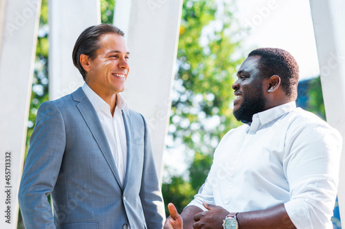 African-American businessman and his colleague in front of modern office building. Financial investors are talking outdoor. Banking and business concept.