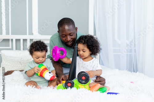african-American family dad with kids babies play and collect a colorful pyramid at home on the bed, happy family
