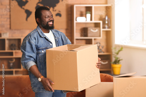 African-American man with moving boxes in his new home