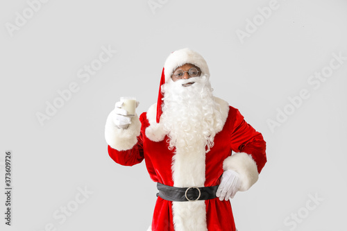 African-American Santa Claus with milk on light background