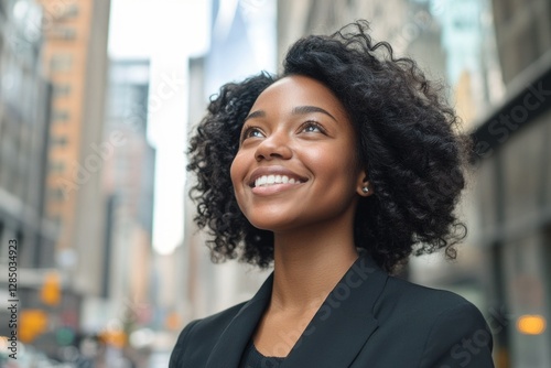 african, american, smiling, woman, professional, blazer, short, hair, curl, bright