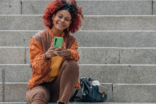 afro american girl on the stairs in the street with mobile phone